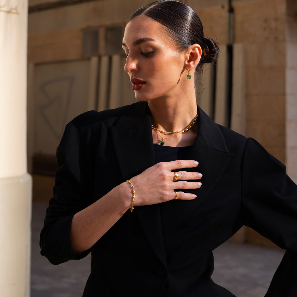 Vi slipar alla stenar i vår egen verkstad, och smyckena har 18 karats guldplätering på 925 sterlingsilver.